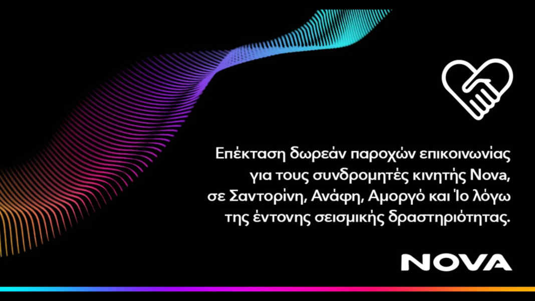 Η Nova, μέλος της United Group, του κορυφαίου παρόχου τηλεπικοινωνιών και Media στη Νοτιοανατολική Ευρώπη, κατανοώντας τις αυξημένες ανάγκες επικοινωνίας λόγω έντονης σεισμικής δραστηριότητας στα νησιά της Σαντορίνης, της Ανάφης, της Αμοργού και της Ίου, ενημερώνει τους συνδρομητές της ότι βρίσκεται κοντά τους επεκτείνοντας την περίοδο παροχής δωρεάν υπηρεσιών επικοινωνίας.