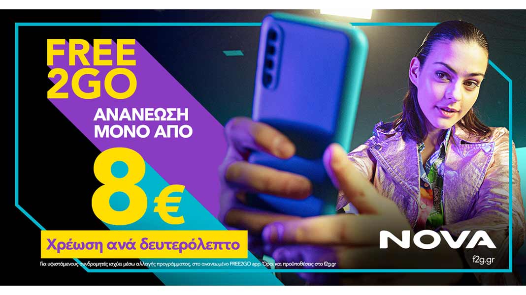 Το νέο FREE2GO από τη Nova ήρθε για να προσφέρει την ιδανική επιλογή στους καταναλωτές καρτοκινητής που ζητούν έλεγχο κόστους με εξαιρετική σχέση ποιότητας και τιμής.