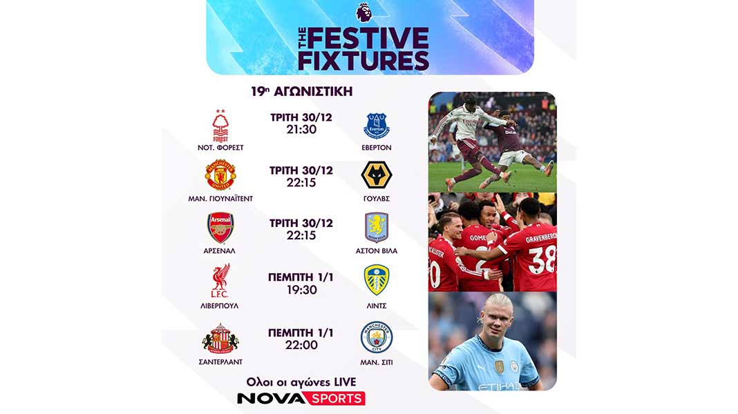 H Premier League, το κορυφαίο πρωτάθλημα στον κόσμο και τη φωνή του Χρήστου Σωτηρακόπουλου στα κανάλια Novasports, συνεχίζεται non stop (40 αγώνες μέσα σε 16 ημέρες) με την παραδοσιακή BoxingDay (18η αγωνιστική) που φέτος περιλαμβάνει μία αναμέτρηση αυτή ανάμεσα σε Μάντσεστερ Γιουνάιτεντ και Νιουκάστλ(26/12, 22:00), ενώ από το υπόλοιπο πρόγραμμα ξεχωρίζουν οι αγωνες Νότιγχαμ Φόρεστ – Μάντσεστερ Σίτι (27/12, 14:30), Λίβερπουλ – Γουλβς (27/12, 17:00), Άρσεναλ – Μπράιτον (27/12, 17:00) και Τσέλσι – Άστον Βίλα (27/12, 19:30). Η συνέχεια είναι καταιγιστική με την 19η αγωνιστική και τα παιχνίδιαΤσέλσι – Μπόρνμουθ (30/12, 21:30), Νότιγχαμ Φόρεστ – Έβερτον (30/12, 21:30), Μάντσεστερ Γιουνάιτεντ – Γουλβς (30/12, 22:15), Άρσεναλ – Άστον Βίλα (30/12, 22:15), Λίβερπουλ – Λιντς (1/1, 19:30) και Σάντερλαντ – Μάντσεστερ Σίτι (1/1, 22:00), ενώ για την 20η αγωνιστική δεσπόζουν οι αναμετρήσειςΆστον Βίλα – Νότγχαμ Φόρεστ (3/1, 14:30), Μπόρνμουθ – Άρσεναλ (3/1, 19:30), Λιντς – Μάντσεστερ Γιουνάιτεντ (4/1, 14:30), Φούλαμ – Λίβερπουλ (4/1, 17:00) και φυσικά το ντέρμπι της αγωνιστικής Μάντσεστερ Σίτι – Τσέλσι (4/1, 19:30). Η Premier League θα πλαισιωθεί με τις εκπομπές«Premier League Kick Off» και «PremierLeagueTheShow» με τον Άγγελο Στυλιάδη και τον Γιώργο Σαμαρά.
