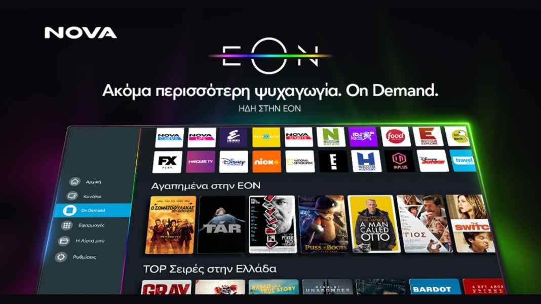 Η Nova με ιδιαίτερη χαρά παρουσιάζει την ανανεωμένη υπηρεσία EON On Demand, στην κορυφαία πλατφόρμα συνδρομητικής τηλεόρασης στη Νοτιοανατολική Ευρώπη, αναβαθμίζοντας και εμπλουτίζοντας την εμπειρία ψυχαγωγίας. Η EON On Demand προσφέρει σύγχρονο και φιλικό προς τον χρήστη user interface, που περιλαμβάνει προτεινόμενο περιεχόμενο, εξατομίκευση και επιλογή λήψης (download), προκειμένου οι συνδρομητές να απολαμβάνουν, όποτε και όπου θέλουν, το περιεχόμενο της επιλογής τους ακόμα και χωρίς σύνδεση. Όλα αυτά είναι τώρα διαθέσιμα σε όλους τους χρήστες της ΕΟΝ.