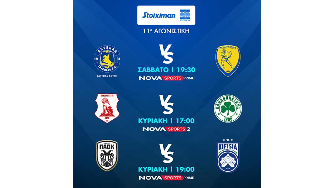 Η Stoiximan Super League, επιστρέφει στην αγωνιστική δράση με την 11η αγωνιστική και τις αναμετρήσεις Asteras Aktor – Παναιτωλικός (22/11, 19:30), Πανσερραϊκός – Παναθηναϊκός (23/11, 17:00), ΠΑΟΚ – Κηφισιά (23/11, 19:00) που θα μεταδοθούν στα κανάλια Novasports. Στα κανάλια Cosmote Sport θα μεταδοθεί το ντέρμπι ΑΕΚ – Άρης (23/11, 21:00) καθώς και τα παιχνίδια Ολυμπιακός – Ατρόμητος (22/11, 20:00), Βόλος ΝΠΣ – Λεβαδειακός (24/11, 18:00) και ΑΕΛ Novibet – ΟΦΗ (24/11, 20:00). Οι αγώνες του ελληνικού πρωταθλήματος θα πλαισιωθούν στο Novasports με την αγαπημένη εκπομπή των φιλάθλων «Η Ώρα των Πρωταθλητών» με τους Γιαννίκο Δούσκα, Λίλα Κουντουριώτη, Αποστόλη Λάμπο, καθώς και με την εκπομπή «Monday Football Club» με τους Γιάννη Πάγκο και Ντέμη Νικολαΐδη.