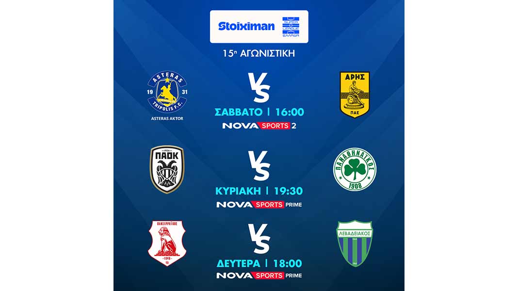 Η Stoiximan Super League, συνεχίζεται με την 15η αγωνιστική και το ντέρμπι  της Τούμπας ΠΑΟΚ – Παναθηναϊκός(21/12, 19:30) που θα μεταδοθεί στα κανάλια Novasports όπως και οι αγώνες Asteras Aktor – Άρης(20/12, 16:00) και Πανσερραϊκός – Λεβαδειακός (22/12, 18:00). Στα κανάλια CosmoteSportθα μεταδοθούν οι αναμετρήσεις Βόλος ΝΠΣ – Παναιτωλικός (20/12, 18:00), Ολυμπιακός – Κηφισιά (20/12, 20:30), ΑΕΛ Novibet – Ατρόμητος (21/12, 17:30), ΑΕΚ – ΟΦΗ (21/12, 21:00). Οι αγώνες του ελληνικού πρωταθλήματος θα πλαισιωθούνστο Novasports με την αγαπημένη εκπομπή των φιλάθλων «Η Ώρα των Πρωταθλητών» με τους Γιαννίκο Δούσκα, Λίλα Κουντουριώτη, Αποστόλη Λάμπο, καθώς και με την εκπομπή «MondayFootballClub» με τους Γιάννη Πάγκο και Ντέμη Νικολαΐδη.