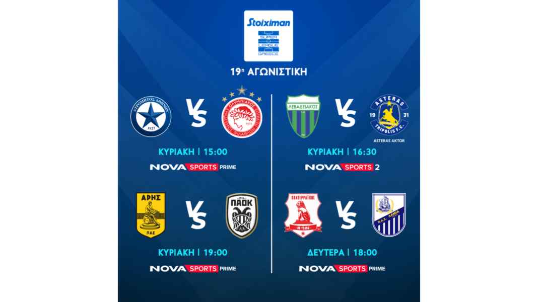 Η Stoiximan Super League, συνεχίζεται με την 19η αγωνιστική με το «El Clasico» της Θεσσαλονίκης, Άρης – ΠΑΟΚ (19/1, 19:00) και τους αγώνες Ατρόμητος – Ολυμπιακός (19/1, 15:00), Λεβαδειακός – Asteras AKTOR (19/1, 16:30) και Πανσερραϊκός – Λαμία (20/1, 18:00) που θα μεταδοθούν από τα κανάλια Novasports. Στα κανάλια Cosmote Sport θα προβληθεί το αθηναϊκό ντέρμπι Παναθηναϊκός – ΑΕΚ (19/1, 20:30), καθώς και οι αγώνες Παναιτωλικός – ΟΦΗ (19/1, 17:00), Athens Kallithea FC – Βόλος ΝΠΣ (18/1, 17:00). Οι αγώνες του ελληνικού πρωταθλήματος θα πλαισιωθούν στο Novasports και με την αγαπημένη εκπομπή των φιλάθλων «Η Ώρα των Πρωταθλητών» με τους Γιαννίκο Δούσκα, Λίλα Κουντουριώτη, Χριστίνα Κομίνη αλλά και με τον «Monday Football Club» με τους Ντέμη Νικολαϊδη και Γιάννη Πάγκο.