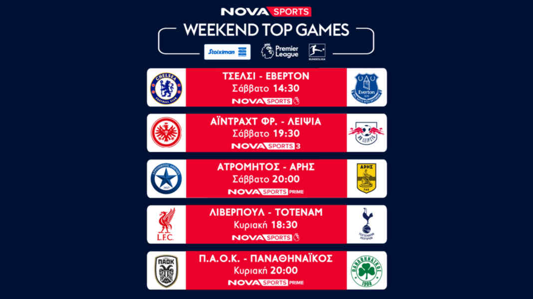 Η Premier League, το κορυφαίο πρωτάθλημα στον κόσμο και με τη φωνή του Χρήστου Σωτηρακόπουλου συνεχίζεται με αμείωτο ενδιαφέρον στο γήπεδο των καναλιών Novasports. Οι συνδρομητές θα απολαύσουν τις αναμετρήσεις Άρσεναλ – Κρίσταλ Πάλας (23/4, 22:00), Τσέλσι – Έβερτον (26/4, 14:30), Μπόρνμουθ – Μάντσεστερ Γιουνάιτεντ (27/4, 16:00) και Λίβερπουλ – Τότεναμ (27/4, 18:30). Οι αγώνες θα πλαισιωθούν και από τις εκπομπές «Premier League Kick» Off και «Premier League The Show» με τους Άγγελο Στυλιάδη και Γιώργο Σαμαρά.