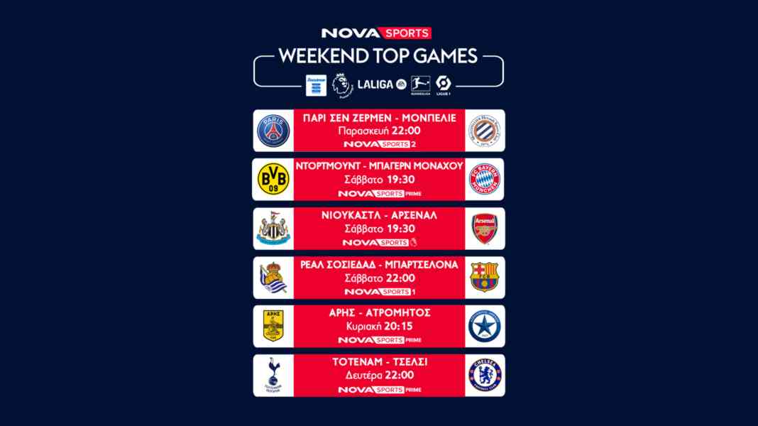 Πλούσιο ποδοσφαιρικό μενού με περισσότερους από 50 LIVE συναρπαστικούς αγώνες έρχεται και αυτή την εβδομάδα αποκλειστικά στο γήπεδο του Novasports! Με το Der Klassiker της Γερμανίας, Ντόρτμουντ – Μπάγερν Μονάχου, τα ντέρμπι Τότεναμ – Τσέλσι και Νιουκάστλ – Άρσεναλ στην Premier League, με τις αμφίρροπες αναμετρήσεις Άρης – Ατρόμητος, ΠΑΣ Γιάννινα – Βόλος, Πανσερραϊκός – ΟΦΗ καθώς και συναρπαστικό θέαμα από LaLiga EA Sports, Ligue 1, Eredivisie και Coppa Italia!