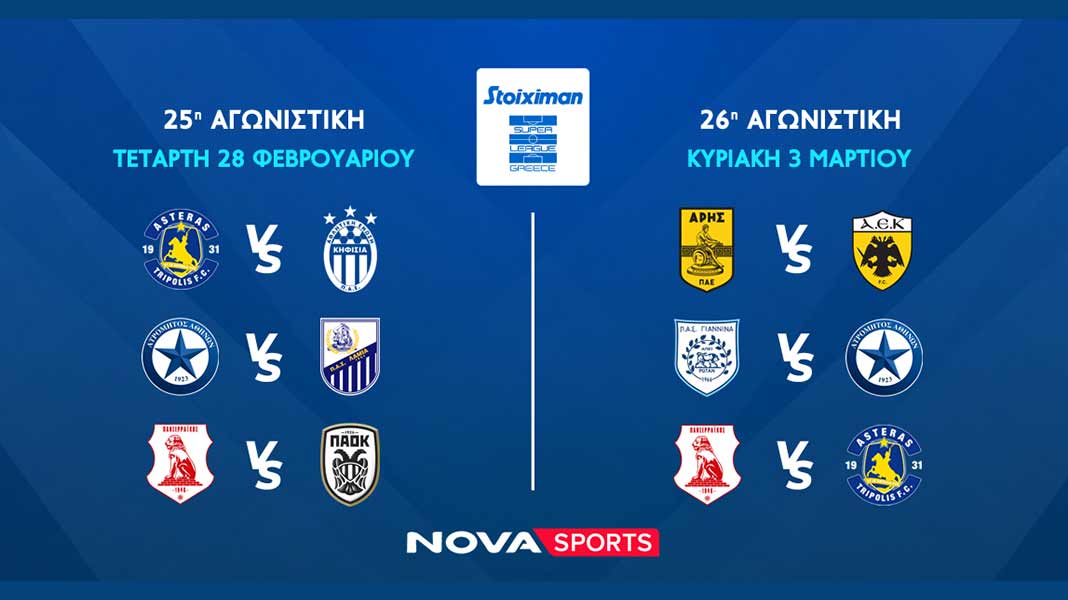 Οι φίλοι του ελληνικού ποδοσφαίρου, θα έχουν την ευκαιρία να απολαύσουν συναρπαστικές αναμετρήσεις για τις δύο τελευταίες αγωνιστικές της κανονικής περιόδου στο πρωτάθλημα της Stoiximan Super League. Για την προτελευταία 25η αγωνιστική θα δουν τους αγώνες Αστέρας Τρίπολης – Κηφισιά (28/2, 15:00), Ατρόμητος – Λαμία (28/2, 17:00) και Πανσερραϊκός – ΠΑΟΚ (28/2, 20:00), ενώ για την τελευταία 26η αγωνιστική θα παρακολουθήσουν το ντέρμπι Άρης  – ΑΕΚ (3/3, 19:30) καθώς και τα παιχνίδια ΠΑΣ Γιάννινα  Ατρόμητος (3/3, 19:30) και Πανσερραϊκός – Αστέρας Τρίπολης (3/3, 19:30). Οι αγώνες του ελληνικού πρωταθλήματος θα πλαισιωθούν και με τις αγαπημένες εκπομπές των φιλάθλων «Η Ώρα των Πρωταθλητών» με τους Γιαννίκο Δούσκα, Λίλα Κουντουριώτη και Χριστίνα Κομίνη καθώς και «Monday Football Cub» & «Novasports Football Club» με τον Ντέμη Νικολαϊδη και τον Γιάννη Πάγκο.