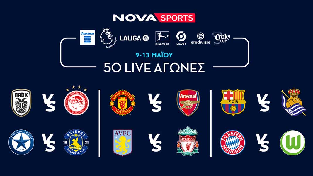 Ποδοσφαιρική πανδαισία έρχεται και αυτή την εβδομάδα στο «γήπεδο» του Novasports με περισσότερους από 50 LIVE αγώνες! Με το καθοριστικό ντέρμπι ΠΑΟΚ – Ολυμπιακός για τη «μάχη» του τίτλου στα Playoffs της Stoiximan Super League, με το φινάλε στα Playouts της Stoiximan Super League με το ντέρμπι της Premier League, Μάντσεστερ Γιουνάιτεντ – Άρσεναλ και τους αγώνες Φούλαμ – Μάντσεστερ Σίτι, Άστον Βίλα – Λίβερπουλ και με Γρανάδα – Ρεάλ Μαδρίτης και Μπαρτσελόνα – Ρεάλ Σοσιεδάδ για την LaLiga EA Sports. Και φυσικά με Bundesliga, Ligue1 και τον τελικό του Croky Cup στο Βέλγιο, Ουνιόν Σεν Ζιλουάζ-Αντβέρπ!