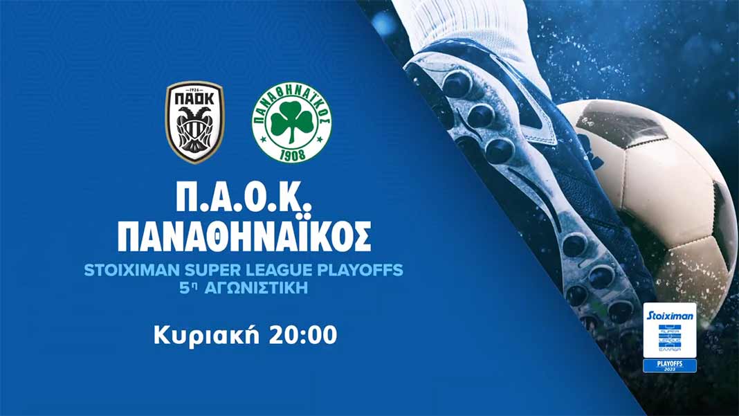 Η Stoiximan Super League επιστρέφει στην αγωνιστική δράση με τα Playoffs και το ντέρμπι της 5ης αγωνιστικής ΠΑΟΚ – Παναθηναϊκός, αλλά και με τα Playouts και οι συνδρομητές θα δουν τις αναμετρήσεις Λεβαδειακός – Ιωνικός και ΠΑΣ Γιάννινα-Παναιτωλικός. Οι αγώνες θα πλαισιωθούν από τις αγαπημένες εκπομπές των φιλάθλων, «Η Ώρα των Πρωταθλητών» με τη Λίλα Κουντουριώτη και Γιαννίκο Δούσκα, καθώς και «Monday Football Club» με τους Ντέμη Νικολαϊδη και Γιάννη Πάγκο.