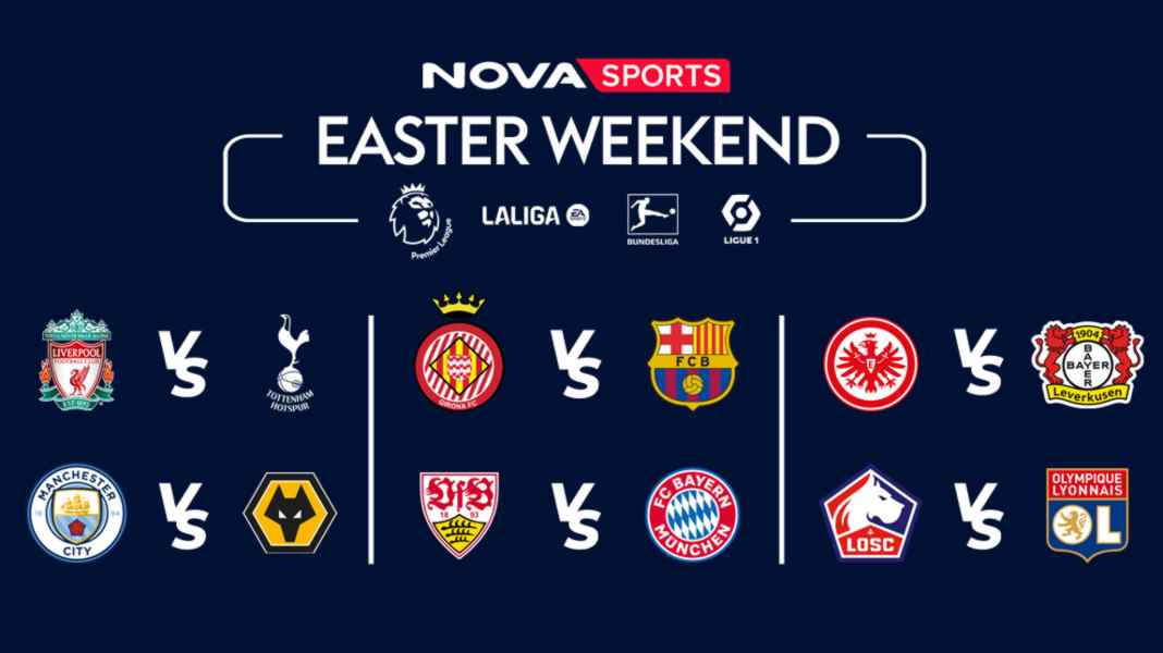 Πλούσιο ποδοσφαιρικό θέαμα μέσα στο Πάσχα έρχεται στις οθόνες των συνδρομητών του Novasports! Με Λίβερπουλ – Τότεναμ, Μάντσεστερ Σίτι – Γουλβς, Άρσεναλ – Μπόρνμουθ με φόντο την μάχη για την κατάκτηση του τίτλου στην Premier League και με Ρεάλ Μαδρίτης – Κάδιθ, Χιρόνα – Μπαρτσελόνα, Μαγιόρκα – Ατλέτικο Μαδρίτης για την LaLiga EA Sports. Με Άιντραχτ Φρανκφούρτης- Λεβερκούζεν, Στουτγκάρδη-Μπάγερν Μονάχου, Ντόρτμουντ – Άουγκμπουργκ για την Bundesliga και με Λιλ – Λιόν, Mονακό – Κλερμόν, Λανς – Κλερμον για την Ligue 1.