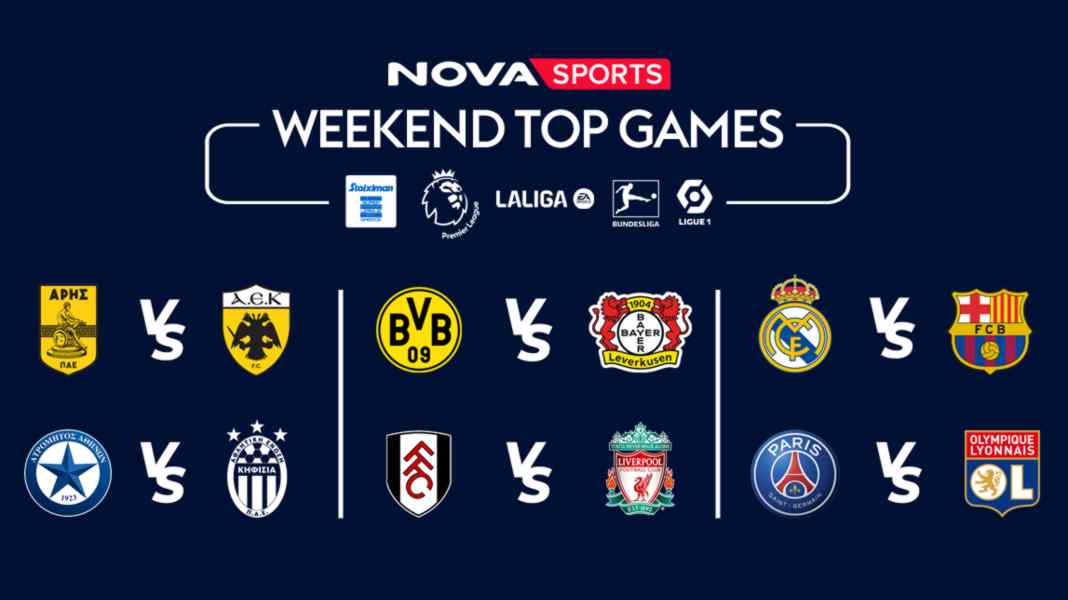 Καρέ των μεγάλων ντέρμπι έρχεται αποκλειστικά στο γήπεδο του Novasports! Με Άρης – ΑΕΚ για τα Playoffs της Stoiximan Super League, με το «El Clasico» Ρεάλ Μαδρίτης – Μπαρτσελόνα για την LaLiga EA Sports, με Ντόρτμουντ – Λεβερκούζεν για την Bundesliga και με Παρί Σεν Ζερμέν – Λιόν για την Ligue! Και φυσικά πλούσιο θέαμα με Αστέρας Τρίπολης – Παναιτωλικός, Ατρόμητος – Κηφισιά & Πανσερραϊκός – ΠΑΣ Γιάννινα για τα Playouts της Stoiximan Super League, με Γουλβς – Άρσεναλ και Φούλαμ – Λίβερπουλ για την Premier League και άλλα πολλά!