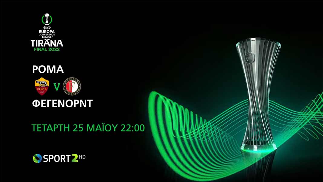 Η κούρσα για την ανάδειξη του τροπαιούχου του UEFA Europa Conference League ολοκληρώνεται την Τετάρτη 25/5 στην COSMOTE TV. Η Ρόμα του Ζοσέ Μουρίνιο και η Φέγενορντ του Άρνε Σλοτ, διεκδικούν το πρώτο τρόπαιο της νεοσύστατης ευρωπαϊκής διοργάνωσης, ζωντανά στα κανάλια COSMOTE SPORT (22.00, COSMOTE SPORT 2HD & COSMOTE SPORT 4K). Ο τελικός θα προβληθεί κι ελεύθερα για το κοινό μέσα από το επίσημο YouTube κανάλι της COSMOTE TV.