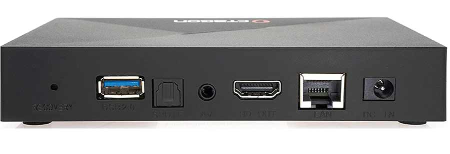 Στη πίσω όψη βρίσκουμε από αριστερά μία οπή για reset, μία θύρα USB 3.0, οπτική έξοδο ψηφιακού ήχου S/PDIF, έξοδο AV (mini jack), HDMI 2.0a με HDCP2.2, Ethernet 10/100 και την υποδοχή για το παρεχόμενο εξωτερικό τροφοδοτικό.