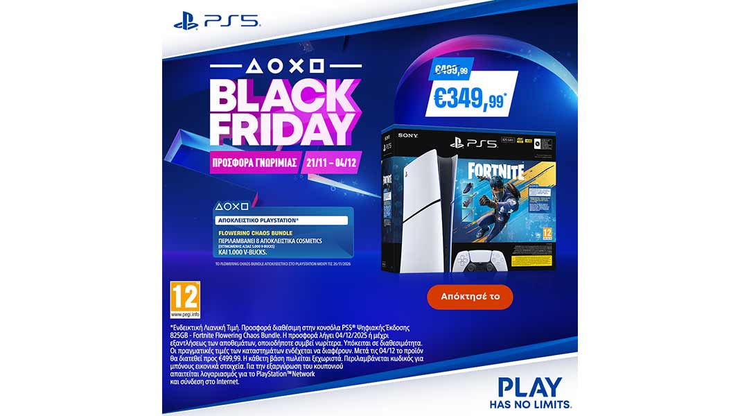 *Ενδεικτική Λιανική Τιμή. Προσφορά γνωριμίας διαθέσιμη στην κονσόλα PS5® Ψηφιακής Έκδοσης 825GB – Fortnite Flowering Chaos Bundle. Η προσφορά λήγει 04/12/2025 ή μέχρι εξαντλήσεως των αποθεμάτων, οποιοδήποτε συμβεί νωρίτερα. Υπόκειται σε διαθεσιμότητα. Οι πραγματικές τιμές των καταστημάτων ενδέχεται να διαφέρουν. Μετά τις 04/12 το προϊόν θα διατεθεί προς €499,99 – Ενδεικτική Λιανική Τιμή. Περιλαμβάνεται κωδικός για μπόνους in-game περιεχόμενο και in-game currency. Το Flowering Chaos Bundle είναι αποκλειστικό στο PlayStation μέχρι τις 26/11/2026. Για την εξαργύρωση του κουπονιού απαιτείται λογαριασμός για το PlayStation™Network και σύνδεση στο Internet.