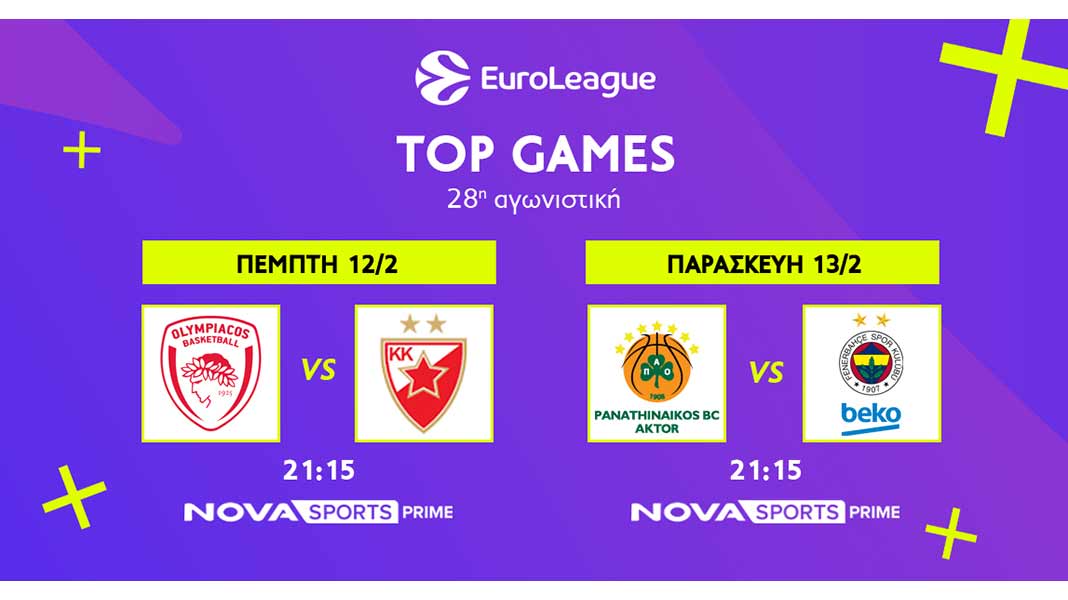 Στην κορυφαία ευρωπαϊκή διασυλλογική διοργάνωση, στην EuroLeague και για την 28η αγωνιστική, o Ολυμπιακός υποδέχεται στο ΣΕΦ τον Ερυθρό Αστέρα (12/2, 21:15), ενώ ο Παναθηναϊκός AKTOR θα αντιμετωπίσει στο κλειστό του ΟΑΚΑ την Φενέρμπαχτσε (13/2, 21:15).
