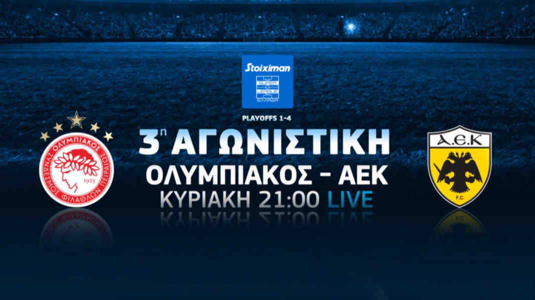 Η 3η αγωνιστική των Playoffs της Stoiximan Super League, που μπορεί να κρίνει τον φετινό πρωταθλητή, έρχεται την Κυριακή 13/4 στην COSMOTE TV. Ο Ολυμπιακός θα υποδεχθεί την ΑΕΚ (21.00, COSMOTE SPORT 1HD), και σε περίπτωση νίκης θα εξασφαλίσει και μαθηματικά τον τίτλο του πρωταθλήματος. Λίγο νωρίτερα, θα διεξαχθεί και το ντέρμπι Παναθηναϊκός-ΠΑΟΚ (19.00, COSMOTE SPORT 2HD). Οι «ερυθρόλευκοι» θα στεφθούν πρωταθλητές και στην περίπτωση που και τα δύο ματς λήξουν ισόπαλα.