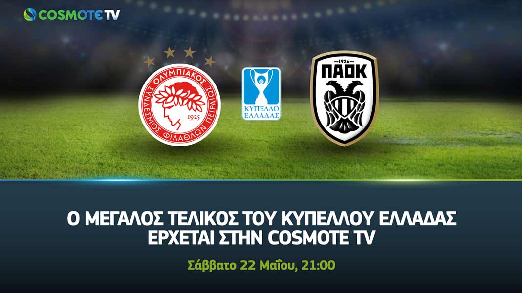 Η ώρα για τον τελικό του Κυπέλλου Ελλάδας έφτασε. Ολυμπιακός και ΠΑΟΚ θα βρεθούν αντιμέτωποι το Σάββατο 22 Μαΐου στις 21.00 στο «ΟΑΚΑ» με το βλέμμα στο τρόπαιο και οι φαν του ποδοσφαίρου θα απολαύσουν τον αγώνα σε ζωντανή αποκλειστική μετάδοση από την COSMOTE TV. Ενόψει της κρίσιμης αναμέτρησης, η έμπειρη δημοσιογραφική ομάδα των καναλιών COSMOTE SPORT HD έχει ετοιμάσει πλούσια κάλυψη, με ειδικές εκπομπές και ζωντανές συνδέσεις με το «ΟΑΚΑ».