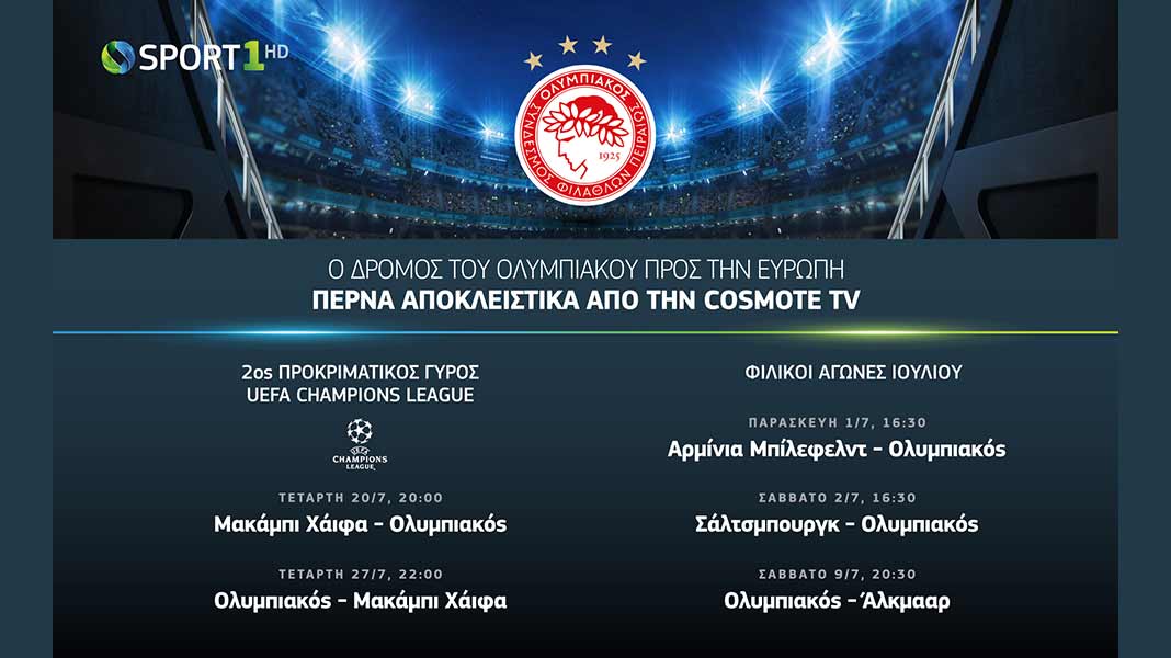 Το COSMOTE SPORT1HD θα μεταδώσει ζωντανά και αποκλειστικά και τις δύο αναμετρήσεις των Πρωταθλητών Ελλάδας απέναντι στην Μακάμπι Χάιφα. Το πρώτο «ραντεβού» των δύο ομάδων έχει οριστεί για την Τετάρτη 20 Ιουλίου στις 20:00 στο Ισραήλ, ενώ η ρεβάνς θα διεξαχθεί μία εβδομάδα αργότερα, Τετάρτη 27 Ιουλίου στις 22:00, στο «Γεώργιος Καραϊσκάκης».