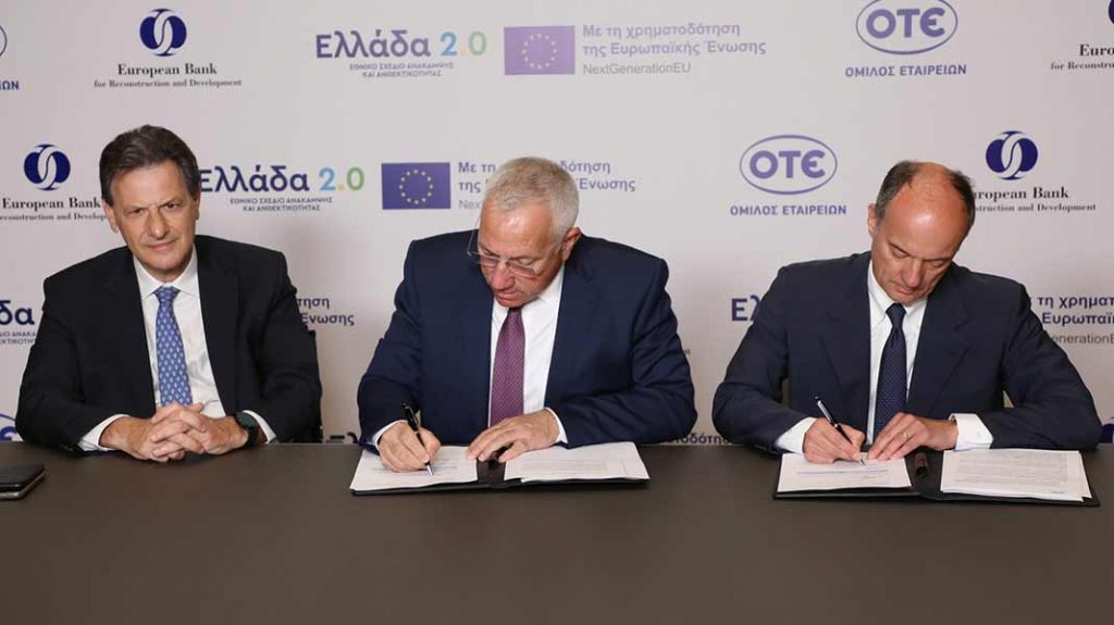 O Οργανισμός Τηλεπικοινωνιών της Ελλάδος Α.Ε. («ΟΤΕ Α.Ε.» ή «Εταιρεία») ανακοινώνει ότι o ΟΤΕ προχωρά στην άντληση κεφαλαίων ύψους €150 εκατ. μέσω δανειακής σύμβασης με την EBRD. Η δανειακή σύμβαση αυτή, είναι η πρώτη που υλοποιείται στη χώρα στον τομέα των ψηφιακών επενδύσεων, με την χρήση δανειακών κεφαλαίων στο πλαίσιο του Εθνικού Σχεδίου Ανάκαμψης και Ανθεκτικότητας «Ελλάδα 2.0» με τη χρηματοδότηση της Ευρωπαϊκής Ένωσης – NextGenerationEU. Οι πόροι αυτοί θα συμβάλουν στην ανάπτυξη δικτύου Fiber to the Home (FTTH) στην ελληνική περιφέρεια από τον ΟΤΕ, στο πλαίσιο του επενδυτικού του πλάνου ύψους άνω των €3 δισ. έως το 2027. Η υπογραφή της συμφωνίας έγινε στο Διοικητικό Μέγαρο του Ομίλου ΟΤΕ, μεταξύ του Dirk Werner (Director, Head of Telecommunications, Media and Technology – EBRD) και του Προέδρου και Διευθύνοντος Συμβούλου του Ομίλου ΟΤΕ, κ. Μιχάλη Τσαμάζ, παρουσία του Υπουργού Οικονομικών κ. Χρήστου Σταϊκούρα, του Αναπληρωτή Υπουργού Οικονομικών κ. Θόδωρου Σκυλακάκη και του Διοικητή της Ειδικής Υπηρεσίας Συντονισμού του Ταμείου Ανάκαμψης κ. Νίκου Μαντζούφα.