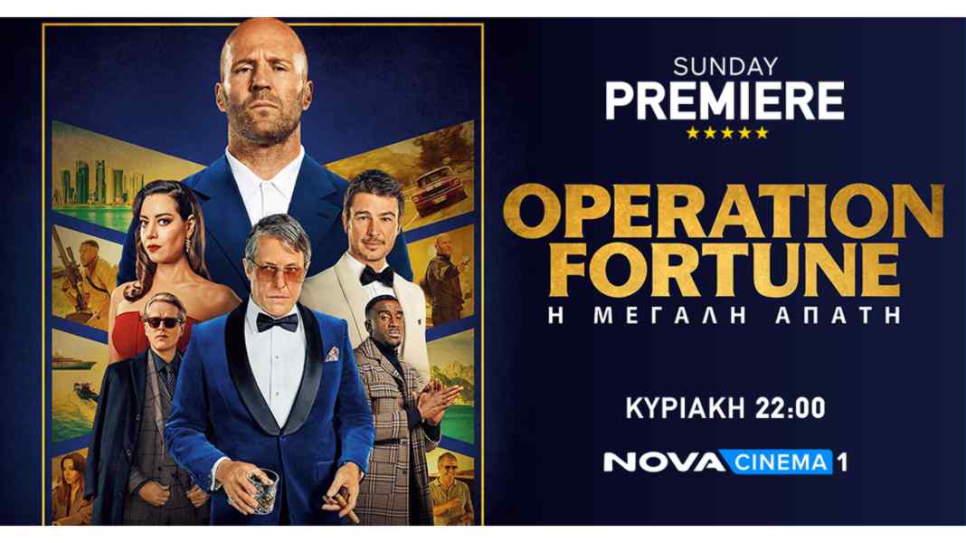 Λάμψη Hollywood έρχεται αυτή την Κυριακή (7/7, 22:00 Novacinema1) στη ζώνη Sunday Premiere της Nova με το blockbuster «Operation Fortune: Ruse de Guerre» («Operation Fortune: Η μεγάλη απάτη», 2023, διάρκειας 114’) και τους Jason Statham, Hugh Grant, Josh Hartnett, Aubrey Plaza στους πρωταγωνιστικούς ρόλους σε σκηνοθεσία του Guy Ritchie.