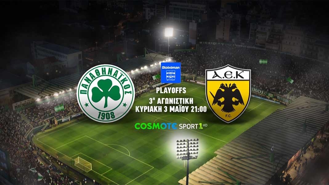 H 3η αγωνιστική των Playoffs 1-4 της Stoiximan Super League φέρνει τη «μάχη» ανάμεσα στον Παναθηναϊκό και την πρωτοπόρο της βαθμολογίας ΑΕΚ, στην COSMOTE TV. Η σέντρα του αθηναϊκού ντέρμπι θα γίνει την Κυριακή 3/5 στις 21:00, στο COSMOTE SPORT 1HD. Την ίδια μέρα, θα διεξαχθεί το ματς ΟΦΗ-Άρης (17:00, COSMOTE SPORT 1HD & START) για την 3η αγωνιστική των Playoffs 5-8, ενώ το Σάββατο 2/5 θα λάβει χώρα ο αγώνας Παναιτωλικός-Κηφισιά (17:00, COSMOTE SPORT 1HD) για την 6η αγωνιστική των Playouts.