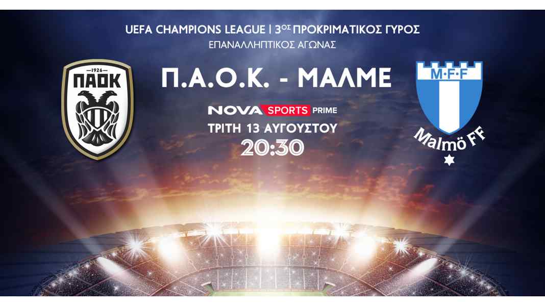 O πρωταθλητής Ελλάδας ΠΑΟΚ επιδιώκει τη διάκριση στο UEFA Champions League και αυτό θα γίνει αποκλειστικά στο «γήπεδο» του Novasports! Οι φίλοι του ποδοσφαίρου την Τρίτη 13 Αυγούστου στις 20:30 θα έχουν την ευκαιρία να δουν ζωντανά και αποκλειστικά στο Novasports Prime και σε περιγραφή του Ισίδωρου Πρίντεζη και ρεπορτάζ των Κωστή Μπότσαρη και Αποστόλη Λάμπου τον επαναληπτικό αγώνα του «Δικέφαλου» του Βορρά κόντρα στην πρωταθλήτρια Σουηδίας Μάλμε, για τον Γ’ προκριματικό γύρο του UEFA Champions League. Από τις 20:00 οι φίλοι του ποδοσφαίρου θα μπουν στο ρυθμό του αγώνα με το Pre Game Show σε παρουσίαση του Ισίδωρου Πρίντεζη.