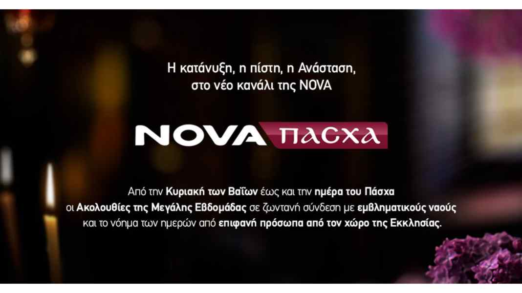 H Nova, μέλος της United Group του κορυφαίου παρόχου τηλεπικοινωνιών και media στη Νοτιοανατολική Ευρώπη αναδεικνύει την κατάνυξη της Μεγάλης Εβδομάδας, από την Κυριακή των Βαΐων 28/4 έως την Κυριακή του Πάσχα 5/5, με το θεματικό κανάλι Nova Πάσχα. Όλοι οι συνδρομητές της Nova, θα έχουν τη δυνατότητα να παρακολουθούν στο ειδικά σχεδιασμένο κανάλι, που θα είναι διαθέσιμο μέσω δορυφόρου και της πλατφόρμας ΕΟΝ στη θέση 200 και με δυνατότητα 7 Days Catch-up, LIVE όλες τις Ακολουθίες, την καθημερινή εκπομπή «Οι Μεγάλες Ημέρες της Πίστης» όπου επιφανή πρόσωπα από το χώρο της εκκλησίας εξηγούν τους συμβολισμούς και τη σημασία της Μ. Εβδομάδας, καθώς και οικογενειακές ταινίες.