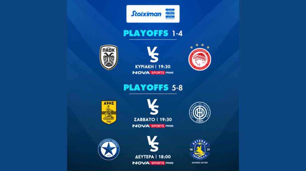 Στη Stoiximan Super League θα διεξαχθούν οι αναμετρήσεις της 2ης αγωνιστικής στα Playoffs για τις θέσεις 1-4 & 5-8 καθώς και στα Playouts για τις θέσεις 9-14. Στα κανάλια Novasports θα μεταδοθούν το ντέρμπι της Τούμπας ΠΑΟΚ – Ολυμπιακός (6/4, 19:30) για τα Playoffs και τις θέσεις 1-4, καθώς και οι αγώνες Άρης – ΟΦΗ (5/4, 19:30) & Aτρόμητος – Αsteras Aktor (7/4, 18:00) για τα Playoffs και τις θέσεις 5-8 και Λεβαδειακός – Πανσερραϊκός (5/4, 17:00) για τα Playouts και τις θέσεις 9-14. Στα κανάλια Cosmote Sport θα προβληθεί το ντέρμπι Παναθηναϊκός – ΑΕΚ (6/4, 21:30) για τα Playoffs και τις θέσεις 1-4, καθώς και ΠΑΣ Λαμία-Athens Kallithea FC (5/4, 20:00), Βόλος ΝΠΣ-Παναιτωλικός (6/4, 17:00) για τα Playouts και τις θέσεις 9-14. Οι αγώνες του ελληνικού πρωταθλήματος θα πλαισιωθούν στο Novasports και με την αγαπημένη εκπομπή των φιλάθλων «Η Ώρα των Πρωταθλητών» με τους Γιαννίκο Δούσκα, Λίλα Κουντουριώτη, Χριστίνα Κομίνη αλλά και με τον «Monday Football Club» με τους Ντέμη Νικολαϊδη και Γιάννη Πάγκο.