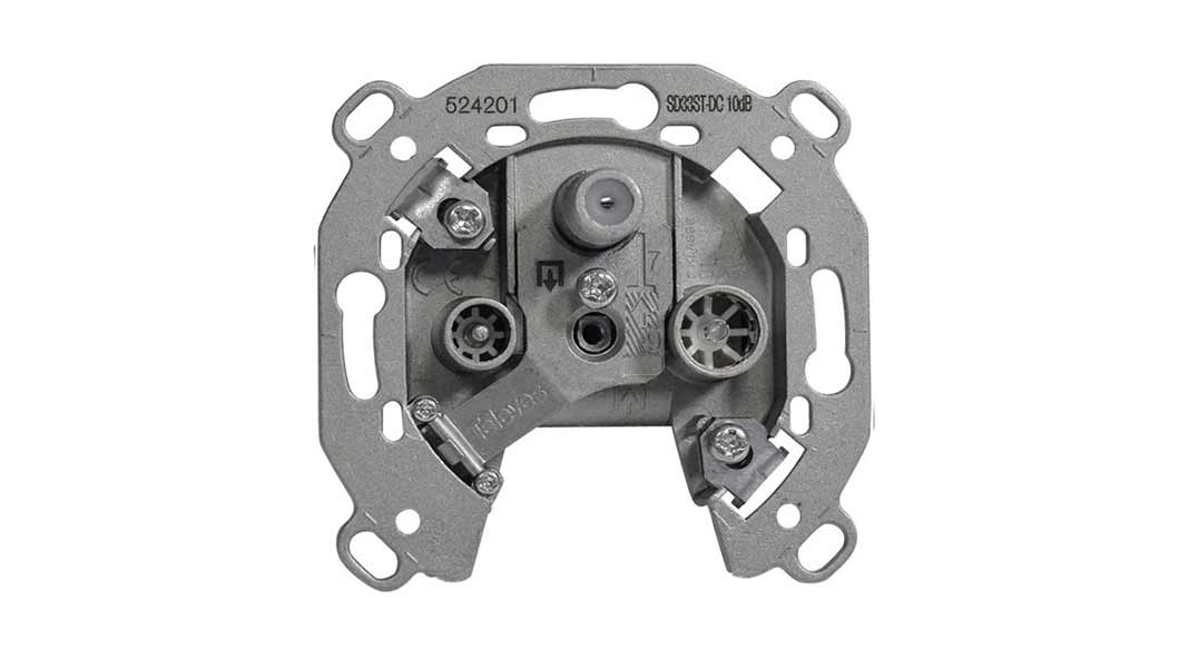 H Televes 524201 είναι πρίζα διελεύσεως τηλεοπτικού σήματος, με 3 ανεξάρτητες εξόδους TV-FM-SAT. Η έξοδος επίγειου σήματος είναι τοποθετημένη κάτω αριστερά, η έξοδος FM κάτω δεξιά και η έξοδος δορυφορικού (F), επάνω στο κέντρο.