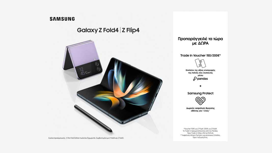 Ξεκίνησαν οι προ-παραγγελίες για τα νέα αναδιπλούμενα Smartphones SAMSUNG Galaxy Z Flip4 5G και Ζ Fold4 5G στα καταστήματα COSMOTE και ΓΕΡΜΑΝΟΣ, αλλά και online στο www.germanos.gr. Τα νέα Smartphones με τον μοναδικό σχεδιασμό τους, είναι ακόμα πιο ανθεκτικά και ισχυρά. Όσοι καταναλωτές τα προ-παραγγείλουν έχουν επιπλέον όφελος έως 200€[1] με την επιστροφή παλαιάς συσκευής και δωρεάν ασφάλιση θραύσης οθόνης για ένα χρόνο μέσω της εφαρμογής SAMSUNG Members. Τα νέα μοντέλα της Samsung θα είναι διαθέσιμα στα καταστήματα COSMOTE και ΓΕΡΜΑΝΟΣ από τις 26 Αυγούστου.