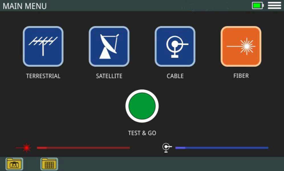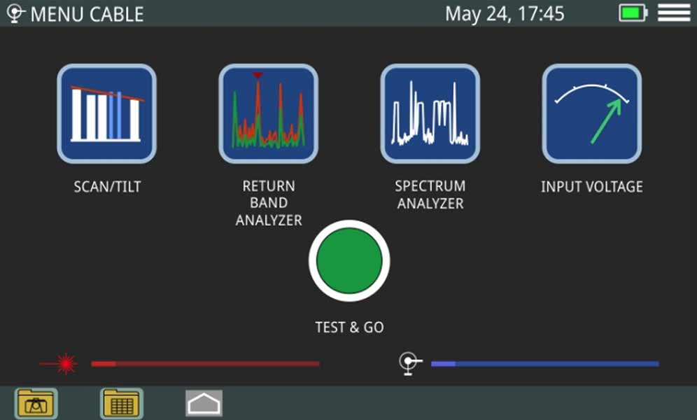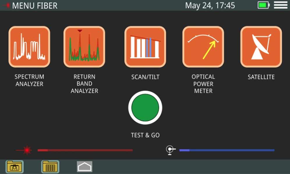 Στο μενού για τις οπτικές μετρήσεις, έχουμε τις επιλογές SPECTRUM ANALYZER, RETURN BAND ANALYZER, SCAN/TILT, OPTICAL POWER METER και SATELLITE. Mε tap στον πράσινο κύκλο TEST & GO – όπως στα άλλα συστήματα – πραγματοποιείται η λειτουργία data logger. Να σημειωθεί ότι η επιλογή SATELLITE, αφορά ένδειξη φάσματος για διανομή δορυφορικών καναλιών μέσω οπτικής ίνας, με τις αντίστοιχες μετρήσεις.