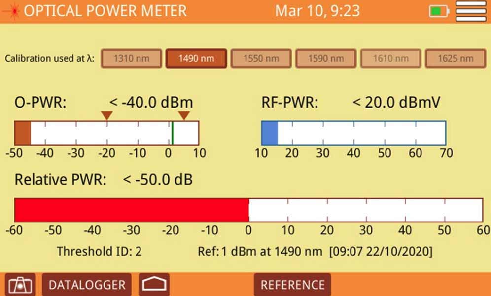Στην επιλογή OPTICAL POWER METER, επιλέγουμε μήκος κύματος της εκάστοτε οπτικής διανομής, μεταξύ 1310, 1490, 1550, 1610, 1625 nm και στη συνέχεια μπορούμε να μετρήσουμε τα εξής: