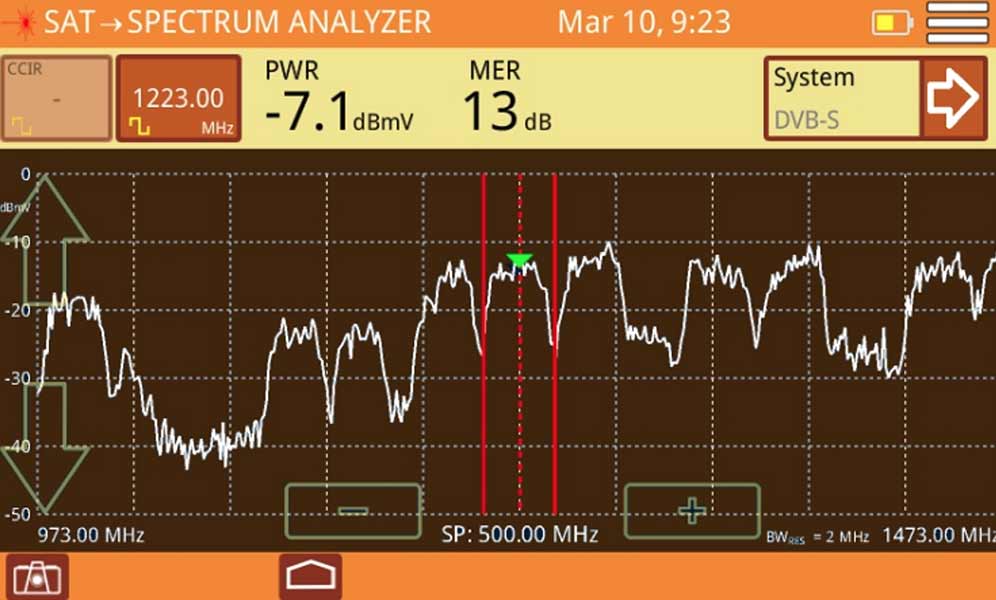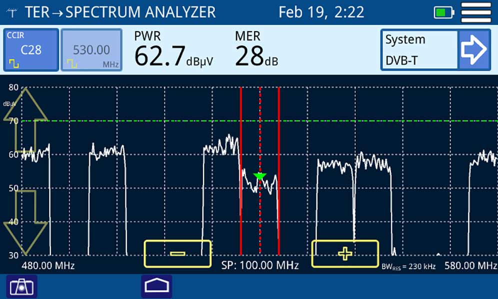 Στην επιλογή SPECTRUM ANALYZER, έχουμε ένδειξη φάσματος με παρόμοιες λειτουργίες μετρήσεων και ρυθμίσεων. Μία προτεινόμενη ρύθμιση η οποία ισχύει και για τις δορυφορικές μετρήσεις, είναι να θέσετε Auto system στην επιλογή Frequency tuning, προκειμένου να εμφανίζεται το εκάστοτε σύστημα, το οποίο στη περίπτωση της επίγειας θα είναι DVB-T. Σαφώς η συγκεκριμένη ρύθμιση, αποκτά περισσότερο νόημα στη δορυφορική λήψη, καθώς θα έχουμε συστήματα DVB-S και DVB-S2.
