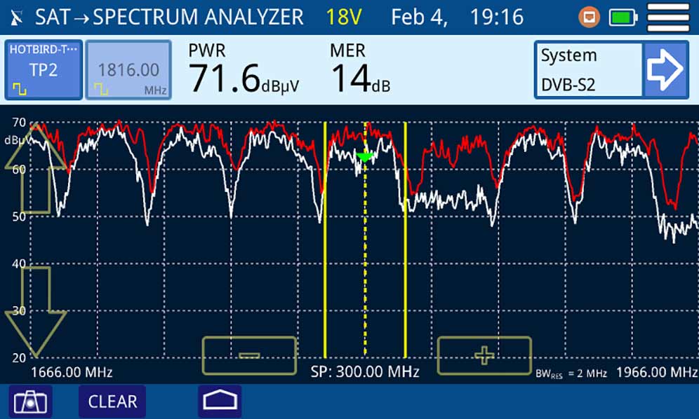 Στο κεντρικό μενού, με tap στην επιλογή SATELLITE εμφανίζεται η σελίδα του φάσματος, στην οποία όμως θα πρέπει πρώτα να εισαγάγουμε κάποιες επιλογές. Μία υποχρεωτική επιλογή είναι η τάση στο LNB ανάλογα την πόλωση και το τμήμα της μπάντας Ku που επιθυμούμε να εμφανίσουμε στο φάσμα. Μία άλλη επιλογή είναι το Auto System που αναφέραμε παραπάνω, προκειμένου να ανιχνεύεται αυτόματα το σύστημα DVB-S ή DVB-S2, καθώς και το Auto Symbol Rate.