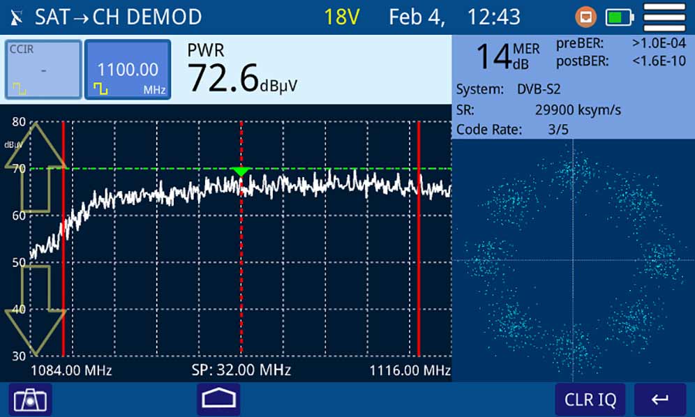 Με tap σε κάποιον transponder, έχουμε μετρήσεις για συχνότητα σε SatIF (ΜΗz), PWR και MER στο επάνω μέρος της οθόνης και με το τοξάκι δεξιά, θα έχουμε τον αστερισμό και τις παραμέτρους MER, preBER, postBER, σύστημα (DVB), Symbol Rate και Code Rate.