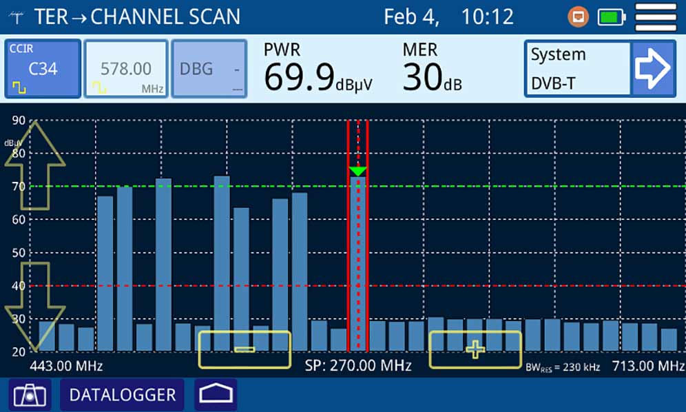 Στο κεντρικό μενού με tap στην επιλογή TERRESTRIAL, εισερχόμαστε στις μετρήσεις και το φάσμα για την επίγεια ψηφιακή. Μία αρχική γρήγορη μέθοδος για να αποκτήσουμε εικόνα των λήψεων της περιοχής μας, είναι να χρησιμοποιήσουμε την επιλογή SCAN, όπου θα εμφανιστούν όλες οι μπάρες για τους ενεργούς αναμεταδότες. Με tap σε κάθε μπάρα, θα έχουμε άμεσα ένδειξη για το κανάλι, την συχνότητα, την στάθμη και το MER, ενώ με το βελάκι δεξιά εμφανίζονται οι πιο λεπτομερείς μετρήσεις και συγκεκριμένα τα preBER, post V.BER, FFT mode και ο αστερισμός. Με το “i” εμφανίζονται και κάποιες επιπλέον παραμέτροι, όπως η διαμόρφωση, το guard interval αλλά και τα code rates.