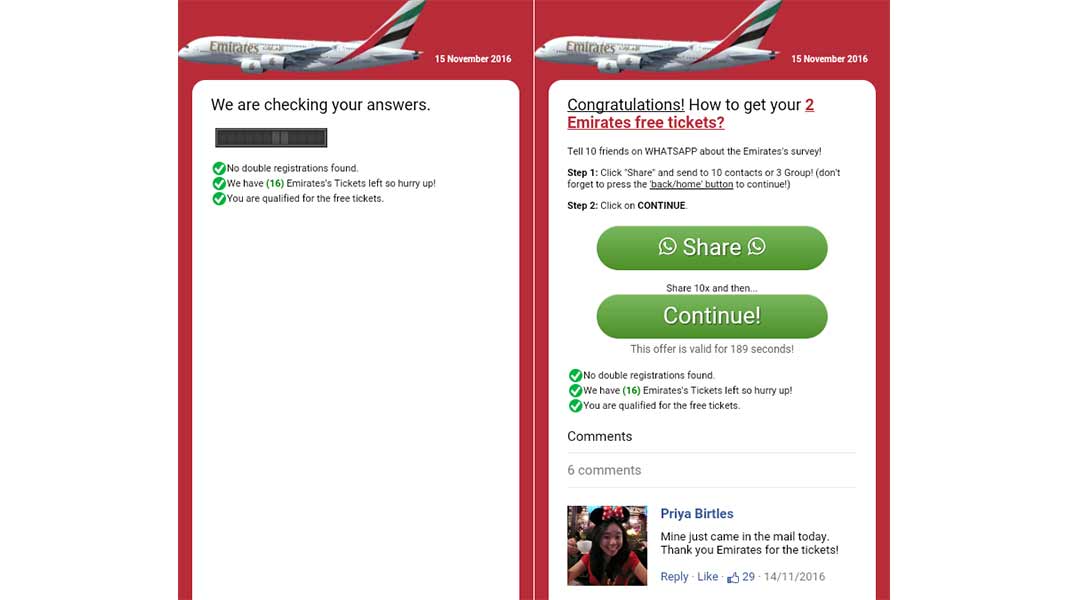 Συχνά, ο χρήστης ανακατευθύνεται πολλές φορές καθ’ οδόν προς την ψεύτικη έρευνα, όπως συνέβη με μια απάτη, η οποία υποσχέθηκε στα θύματα μια δωροκάρτα Ulta Beauty αξίας 500 δολαρίων.