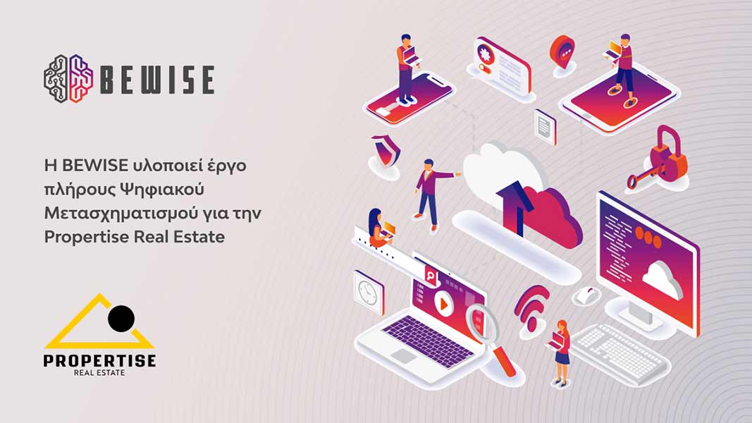 Η εταιρεία Propertise Real Estate, ένα από τα μεγαλύτερα μεσιτικά γραφεία στη χώρα μας, ανέθεσε στην BEWISE την υλοποίηση του πλήρους ψηφιακού μετασχηματισμού του οργανισμού, με στόχο την αποτελεσματικότερη παρακολούθηση των ακινήτων, των εισερχόμενων ζητήσεων και των επικοινωνιών που πραγματοποιούνται με πελάτες για την άμεση και αξιόπιστη διεκπεραίωση των αιτημάτων τους, ενώ παρέχεται η δυνατότητα μέτρησης της απόδοσης συνόλου του οργανισμού. Στα πλαίσια του έργου με στόχο το επιδιωκόμενο αποτέλεσμα, υλοποιήθηκαν σε ένα ενιαίο περιβάλλον τα εξής: