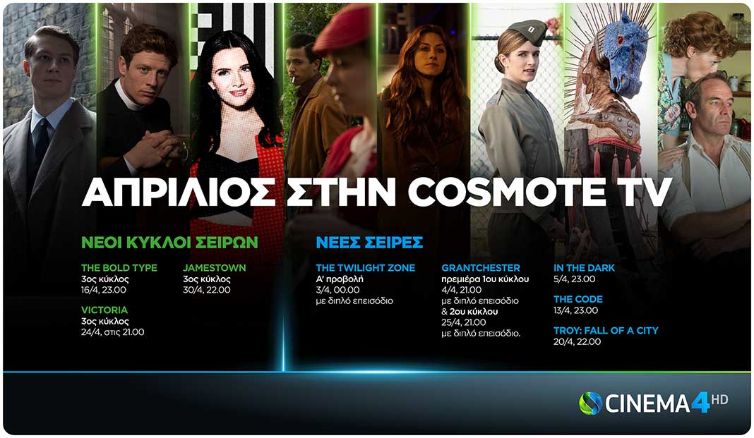 Στις πρεμιέρες του μήνα ξεχωρίζει το πολυαναμενόμενο reboot της εμβληματικής σειράς επιστημονικής φαντασίας The Twilight Zone, με παραγωγό και παρουσιαστή τον βραβευμένο με OSCAR και Emmy, Τζόρνταν Πιλ (Get Out, Us), που αναλαμβάνει τον ρόλο του θρυλικού δημιουργού της σειράς, Ροντ Σέρλινγκ. Το The Twilight Zone έρχεται σε Α΄ προβολή στην COSMOTE TV και θα κάνει πρεμιέρα με διπλό επεισόδιο στο COSMOTE CINEMA 4HD, αλλά και την υπηρεσία COSMOTE TV PLUS, την Τετάρτη 3 Απριλίου στις 00.00. Από το Σάββατο 13 Απριλίου και κάθε Σάββατο, η σειρά θα προβάλλεται στις 21.00.
