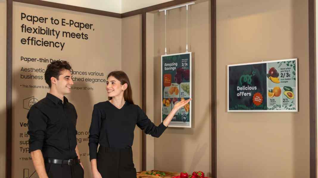 Η Color e-paper της Samsung (μοντέλο EMDX) συνδυάζει το ψηφιακό μελάνι με την καινοτόμο τεχνολογία έγχρωμου ηλεκτρονικού χαρτιού. Αυτή η οθόνη εξαιρετικά χαμηλής κατανάλωσης, ελαφριά και λεπτή, λειτουργεί ως μια οικολογική εναλλακτική λύση στα παραδοσιακά αναλογικά και χάρτινα διαφημιστικά υλικά, παρέχοντας παράλληλα την υψηλή ορατότητα και λειτουργικότητα που απαιτούν οι επιχειρήσεις.