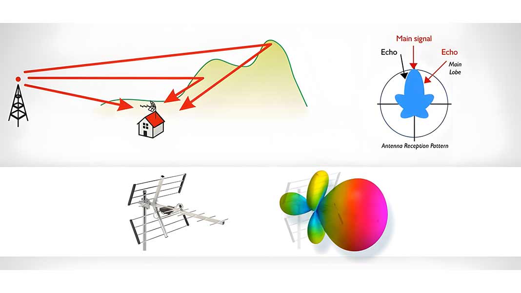 Ο εγκαταστάτης που αντιμετωπίζει αυτά τα echos, μπορεί μόνο να παίξει με τη θέση και τον προσανατολισμό της κεραίας λήψης, προκειμένου να ελαχιστοποιήσει τις αρνητικές επιπτώσεις που μπορεί να έχουν στη λήψη σήματος. Οι κεραίες που χρησιμοποιούνται συνήθως σε εγκαταστάσεις λήψης τηλεόρασης είναι τύπου Yagi και έχουν διάγραμμα ακτινοβολίας όπως αυτό του σχήματος. Αν έχουμε την κεραία μας ευθυγραμμισμένη έτσι ώστε να λαμβάνουμε ένα μέγιστο επίπεδο σήματος, καλό C/N, MER κτλ, θα χρειαστεί να περιστρέψουμε την κεραία για να ελαχιστοποιήσουμε την επίδραση της ηχούς και να την κάνουμε να πέσει έξω από τους κύριους και δευτερεύοντες λοβούς, αλλά προσέχοντας να μην υποβαθμίσουμε πολύ το κύριο σήμα.