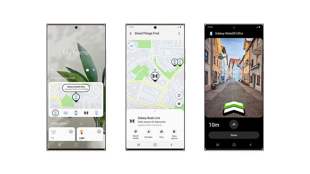 Ο εντοπισμός της συσκευής γίνεται ακόμα πιο γρήγορα, με ενσωματωμένους χάρτες και την δυνατότητα παραγωγής χαρακτηριστικού ήχου από τη συσκευή. Ο χρήστης μπορεί να ενεργοποιήσει την υπηρεσία SmartThings Find στο smartphone ή το tablet του, και στη συνέχεια να επιλέξει τη συσκευή που θέλει να εντοπίσει. Στη συνέχεια, το smartphone θα του δείξει την ακριβή τοποθεσία της συσκευής στο χάρτη. Μόλις πλησιάσει σε αυτήν, ο χρήστης μπορεί να επιλέξει είτε να «κουδουνίσει» η συσκευή ή να την εντοπίσει μέσω της AR λειτουργίας Search Nearby6, που εμφανίζει έγχρωμα γραφικά, των οποίων η ένταση αυξάνεται όταν πλησιάζει στη συσκευή.