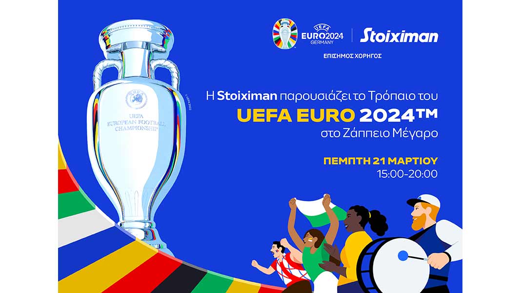 Η Stoiximan, το brand που διαχειρίζεται η Kaizen Gaming, η Επίσημη Παγκόσμια Χορηγός του UEFA EURO 2024, φέρνει στην Αθήνα το τρόπαιο για το οποίο θα αγωνιστούν 24 εθνικές ομάδες της Γηραιάς Ηπείρου στα γήπεδα της Γερμανίας. Η επίσημη παρουσίασή του στο φίλαθλο κοινό θα πραγματοποιηθεί σε μια ξεχωριστή εκδήλωση, που θα λάβει χώρα την Πέμπτη 21 Μαρτίου, από τις 15.00 έως τις 20.00, στο Ζάππειο Μέγαρο.