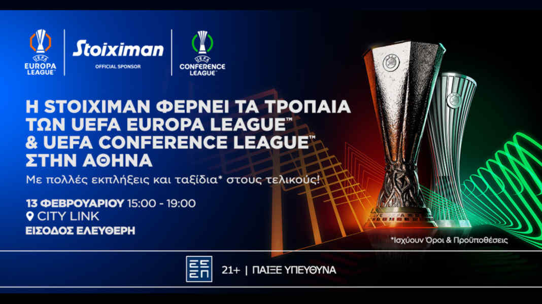 Η Stoiximan, Επίσημος Χορηγός του UEFA Europa League™ και του UEFA Conference League™ σε Ελλάδα και Κύπρο, σας προσκαλεί σε μία μοναδική εκδήλωση αφιερωμένη στα τρόπαια των δύο διοργανώσεων, την Πέμπτη 13 Φεβρουαρίου, από τις 15:00 έως τις 19:00, στην στοά του City Link στο Σύνταγμα.