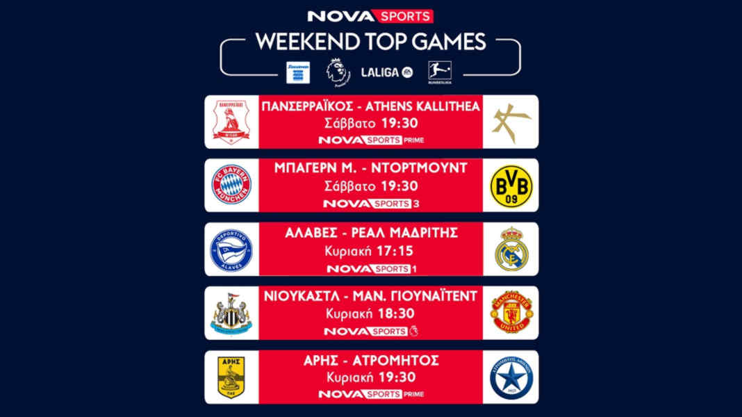 Η Premier League, το κορυφαίο πρωτάθλημα στον κόσμο και με τη φωνή του Χρήστου Σωτηρακόπουλου συνεχίζεται με αμείωτο ενδιαφέρον στο γήπεδο των καναλιών Novasports. Οι συνδρομητές θα απολαύσουν για την 32η αγωνιστική Μάντσεστερ Σίτι-Κρίσταλ Πάλας (12/4, 14:30), Νότιγχαμ Φόρεστ-Έβερτον (12/4, 17:00), Άρσεναλ-Μπρέντφορντ (12/4, 19:30), Λίβερπουλ – Γουέστ Χαμ (13/4, 16:00) και Νιουκάστλ-Μάντσεστερ Γιουνάιτεντ (13/4, 18:30).