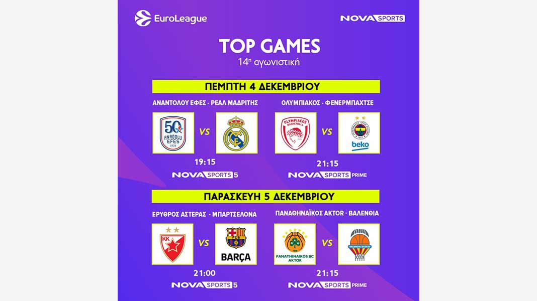 Στο EuroCup με τη διπλή ελληνική εκπροσώπηση, οι ομάδες επιστρέφουν στην αγωνιστική δράση με τη διεξαγωγή της 9ης αγωνιστικής και τις αναμετρήσεις Άρης Betsson-Κλουζ Ναπόκα (4/12, 20:00) και Μπεσίκτας-Πανιώνιος Cosmorama Travel (5/12, 19:00). Παράλληλα, την επόμενη εβδομάδα για την 10η αγωνιστική οι φίλοι του μπάσκετ θα απολαύσουν τους αγώνες Νάινερς Κέμνιτς-Πανιώνιος (9/12, 20:00, Novasports Prime) & Άρης Betsson-Βενέτσια (10/12, 20:00 Novasports Prime), καθώς και τις αναμετρήσεις Μπεσίκτας-Λιετκαμπέλις (9/12, 19:00, Novasports5), Μπουργκ-Τρέντο (9/12, 20:30, Novasports4), Χάποελ Ιερουσαλήμ-Αμβούργο (9/12, 21:00, Novasports Start), Μπουντούτσνοστ-Λόντον Λάιονς (10/12, 20:00, Novasports4), Ουλμ-Άνκαρα (10/12, 20:00, Novasports Start), Μανρέσα-Τσεντεβίτα Ολίμπια (10/12, 21:45, Novasports5).