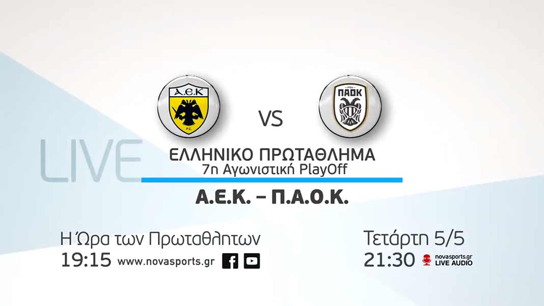 21:30ΑΕΚ – ΠΑΟΚ, Novasports1HD και ηχητικά στο Novasports.gr σε περιγραφή του Ισίδωρου Πρίντεζη και του Ηλία Βλάχου και ρεπορτάζ των Γιώργου Βασιλείου και Κωστή Μπότσαρη