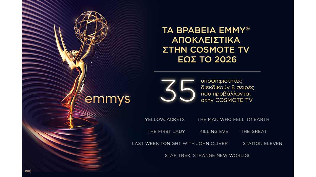 Τα βραβεία Emmy, έναν από τους μεγαλύτερους τηλεοπτικούς θεσμούς παγκοσμίως, που τιμά τις καλύτερες ερμηνείες και σειρές που ξεχωρίζουν κάθε χρόνο στη «μικρή οθόνη», εξασφάλισε αποκλειστικά για τους συνδρομητές της έως το 2026, η COSMOTE TV. To πρώτο ραντεβού των τηλεθεατών της με τα Emmy θα δοθεί την Τρίτη 13/9, για την 74η τελετή απονομής.