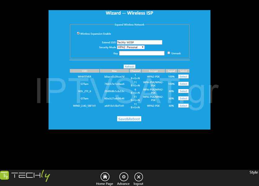 Η περίπτωση του repeater είναι η πιο δημοφιλής, καθώς δεν απαιτούνται καλώδια. Στην αντίστοιχη σελίδα, εμφανίζονται όλα τα διαθέσιμα ασύρματα δίκτυα και φυσικά επιλέγουμε το δικό μας. Στη συνέχεια εισάγουμε το SSID της επιλογής μας, το κλειδί του δικτύου μας και κλικ στο Save&Reboot. Πλέον, θα μπορούμε να συνδέουμε ασύρματα τις συσκευές μας με το νέο δίκτυο, χωρίς να απαιτείται καλωδιακή σύνδεση του Techly. Η χρήση αυτής της λειτουργίας, προορίζεται κυρίως για επέκταση του ασύρματου δικτύου, συνεπώς τοποθετούμε το Techly σε μία πρίζα στην οποία υπάρχει μεν το βασικό μας WiFi, αλλά πλησιάζει στο όριό του. Να αναφέρουμε ότι με αυτή τη λειτουργία (Repeater), μπορούμε να συνδέσουμε στο Techly και συσκευές μέσω των 2 θυρών Ethernet.