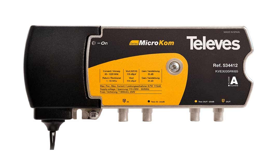 Ο Ενισχυτής γραμμής Televes MicroKom 534412, διαθέτει ενεργό Return Path έως 1220 ΜΗΖ και είναι συμβατός με DOCSIS 3.1. Ο ενισχυτής διαθέτει ρυθμιζόμενη είσοδο και έξοδο μέσω jumper, με την εξασθένιση να μεταβάλλεται κατ’ επιλογή από 0-18 dB, σε βήματα των 2dB.