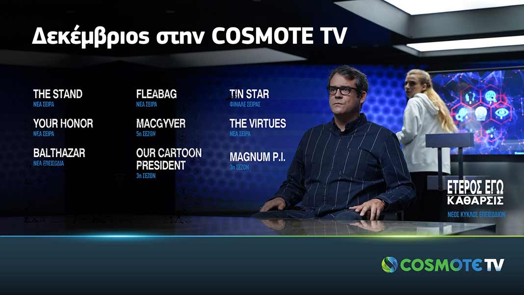 Στις πρεμιέρες του μήνα ξεχωρίζουν μεταξύ άλλων και η σειρά «Fleabag» που υπογράφει η σεναριογράφος του Killing Eve, Φίμπι Γουόλερ-Μπριτζ, και νέοι κύκλοι επεισοδίων από σειρές που έχει αγαπήσει το ελληνικό κοινό, όπως: «Tin Star»,«Magnum P.I.», «MacGyver» κ.α. Επίσης, αποκλειστικά στην COSMOTE TV, κάνει πρεμιέρα το δεύτερο μέρος της τηλεοπτικής ανθολογίας του «Έτερος Εγώ», με τίτλο «Έτερος Εγώ – Κάθαρσις», που βασίζεται στο ομώνυμο βραβευμένο αστυνομικό θρίλερ του 2016, με πολυπληθές καστ καταξιωμένων ηθοποιών.